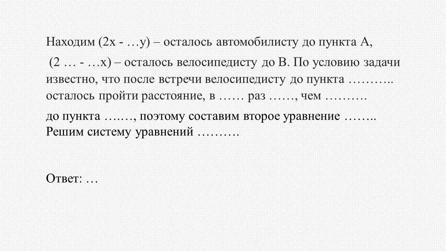(2 … - …х) – осталось велосипедисту до В. По условию задачи известно, что после встречи велосипедисту до пункта ……….. осталось пройти расстояние, в …… раз ……, чем ……….