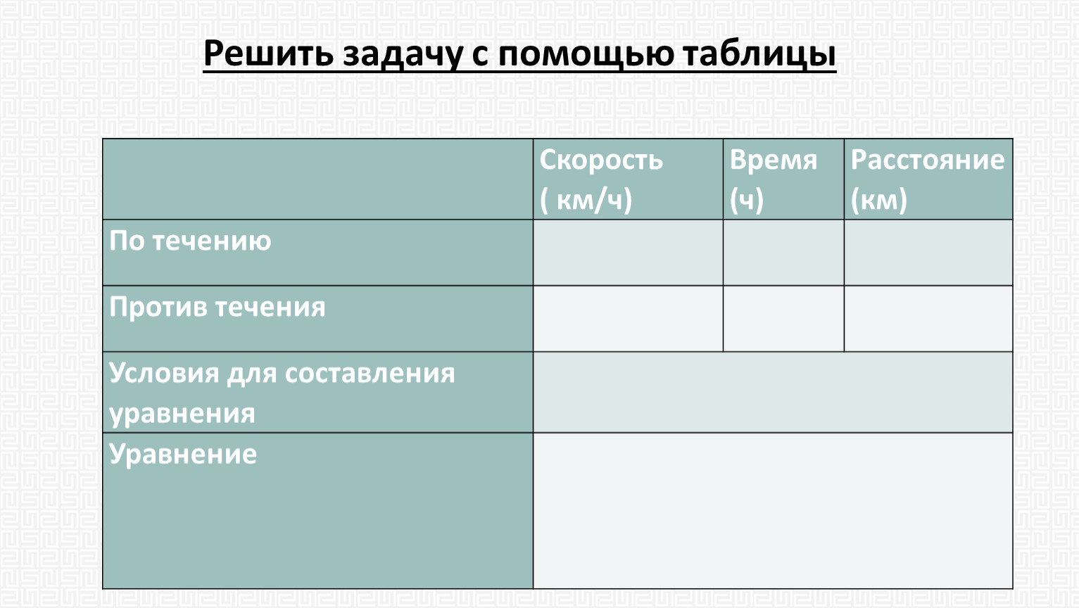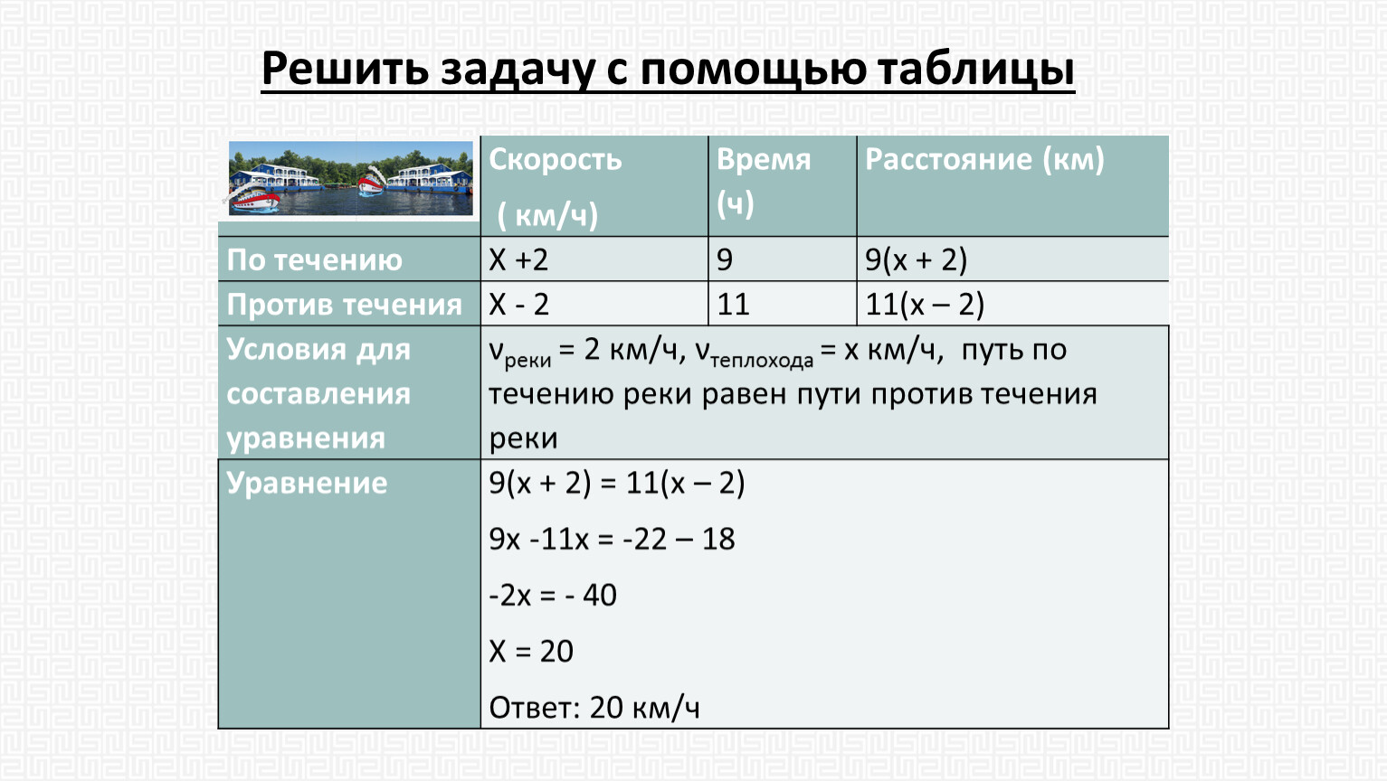 Условия для составления уравнения | νреки = 2 км/ч, νтеплохода = х км/ч, путь по течению реки равен пути против течения реки | ||