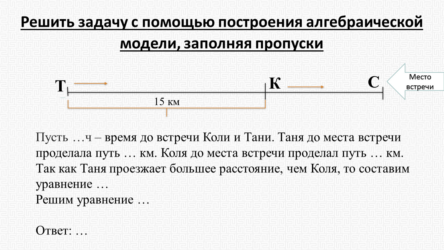 Пусть …ч – время до встречи Коли и Тани. Таня до места встречи проделала путь … км. Коля до места встречи проделал путь … км. Так как Таня проезжает большее расстояние, чем Коля, то составим уравнение …