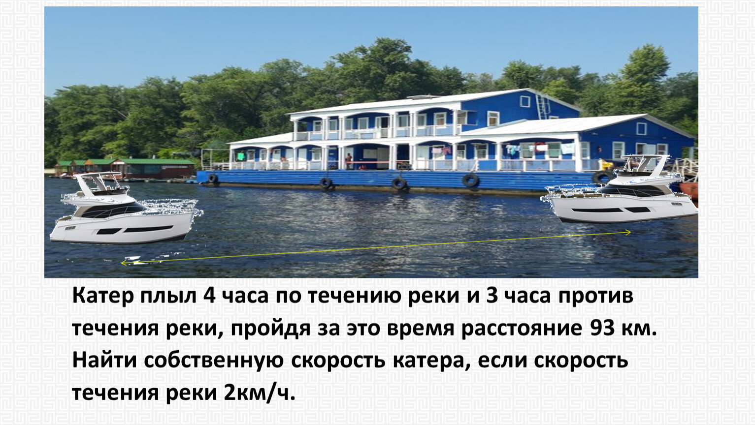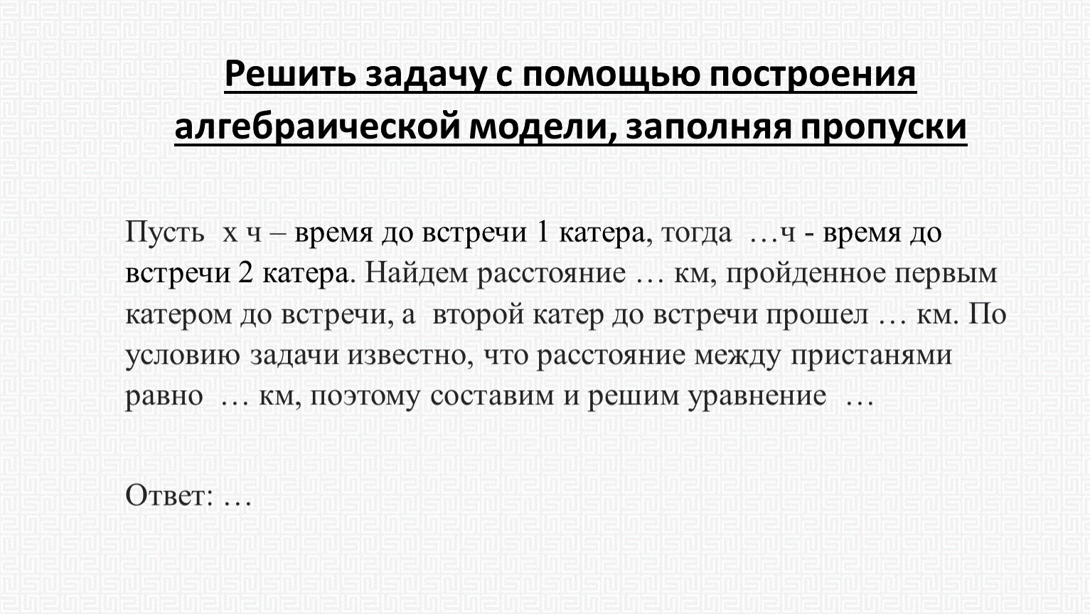 Пусть х ч – время до встречи 1 катера, тогда …ч - время до встречи 2 катера. Найдем расстояние … км, пройденное первым катером до встречи, а второй катер до встречи прошел … км. По условию задачи известно, что расстояние между пристанями равно … км, поэтому составим и решим уравнение …