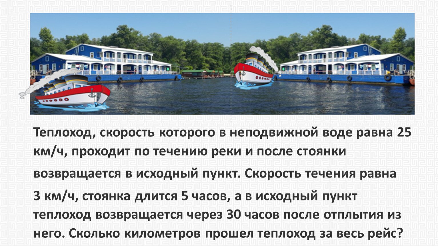 3 км/ч, стоянка длится 5 часов, а в исходный пункт теплоход возвращается через 30 часов после отплытия из него. Сколько километров прошел теплоход за весь рейс?