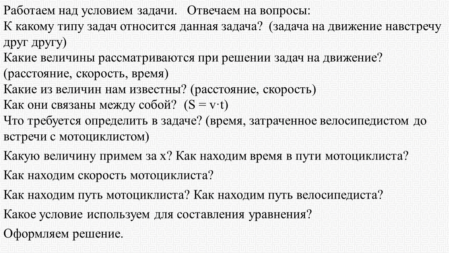 Что требуется определить в задаче? (время, затраченное велосипедистом до встречи с мотоциклистом)