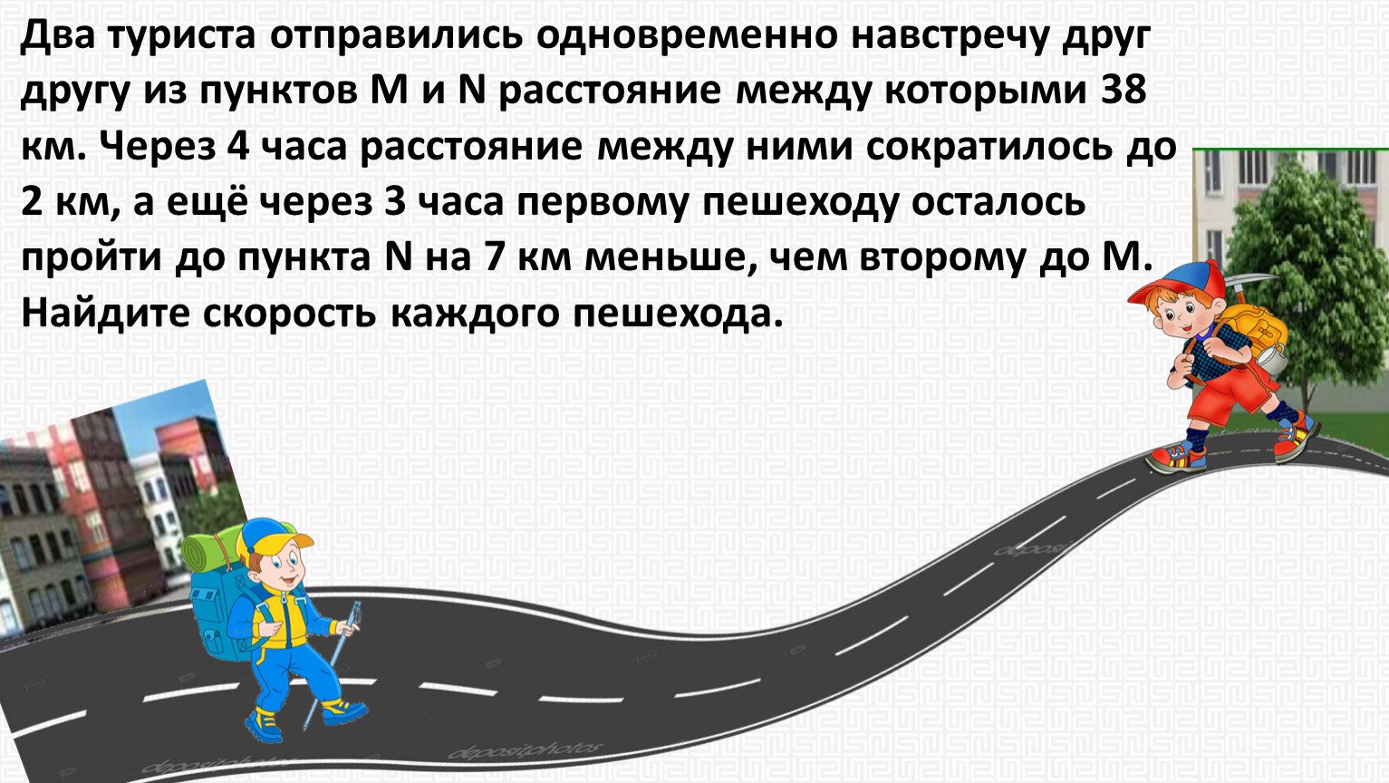 Два туриста отправились одновременно навстречу друг другу из пунктов M и N расстояние между которыми 38 км. Через 4 часа расстояние между ними сократилось до 2 км, а ещё через 3 часа первому пешеходу осталось пройти до пункта N на 7 км меньше, чем второму до M. Найдите скорость каждого пешехода.