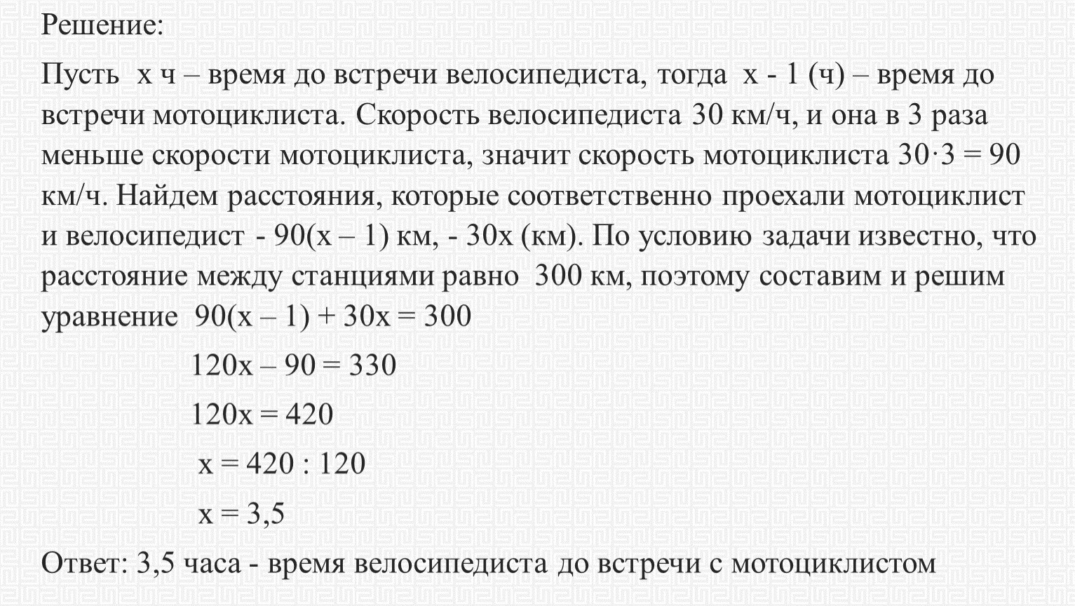 Пусть х ч – время до встречи велосипедиста, тогда х - 1 (ч) – время до встречи мотоциклиста. Скорость велосипедиста 30 км/ч, и она в 3 раза меньше скорости мотоциклиста, значит скорость мотоциклиста 30·3 = 90 км/ч. Найдем расстояния, которые соответственно проехали мотоциклист и велосипедист - 90(х – 1) км, - 30х (км). По условию задачи известно, что расстояние между станциями равно 300 км, поэтому составим и решим уравнение 90(х – 1) + 30х = 300