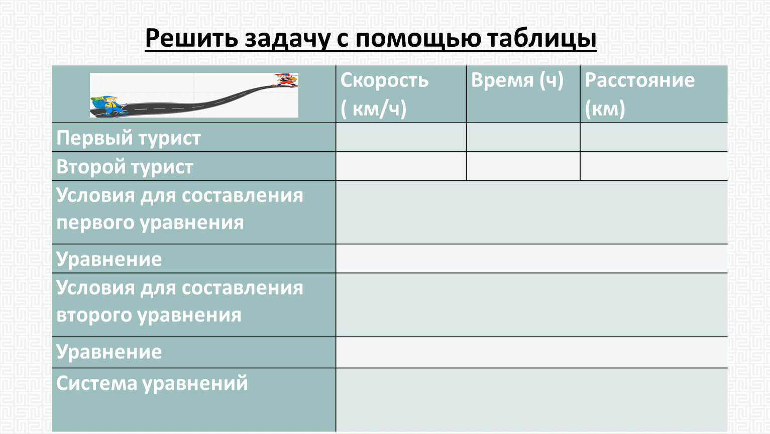 По условию задачи известно, что расстояние между пунктами равно …, поэтому составим уравнение: