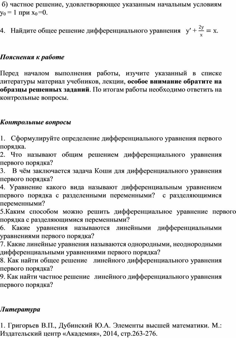 1) изучить понятия: дифференциальное уравнение первого порядка, общее решение дифференциального уравнения первого порядка, задача Коши;