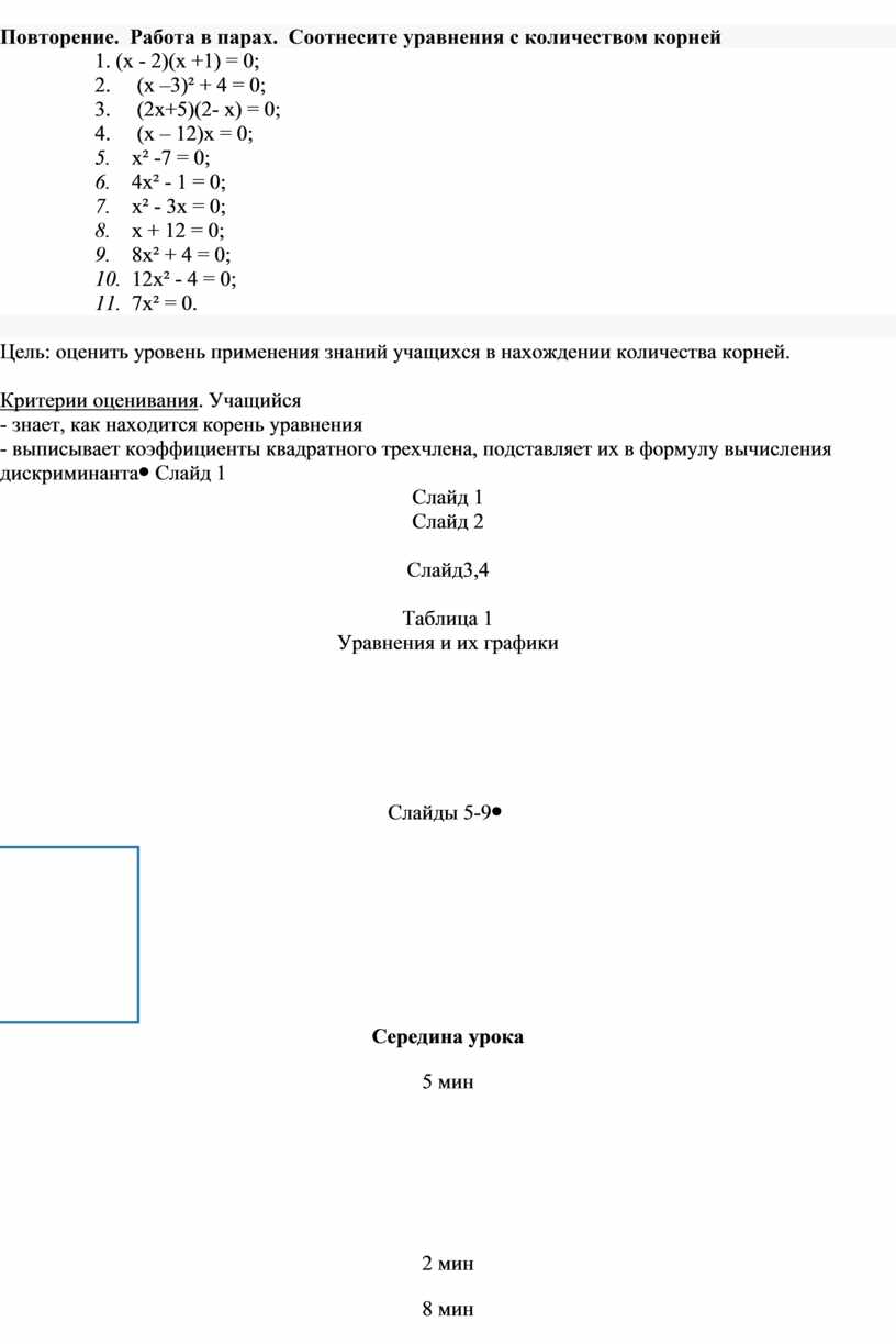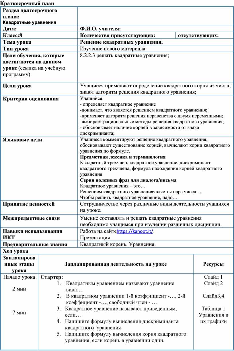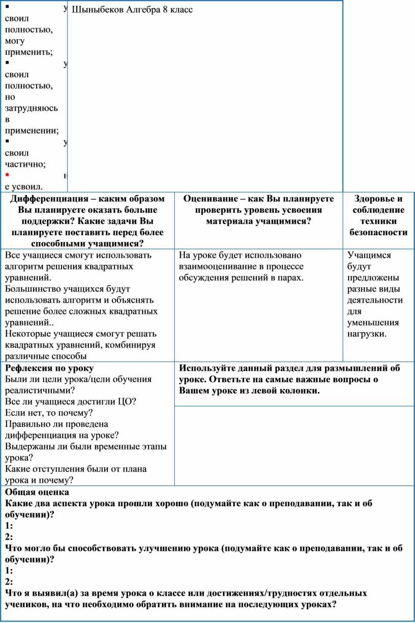 Все учащиеся смогут использовать алгоритм решения квадратных уравнений. Большинство учащихся будут использовать алгоритм и объяснять решение более сложных квадратных уравнений.. Некоторые учащиеся смогут решать квадратных уравнений, комбинируя различные способы |