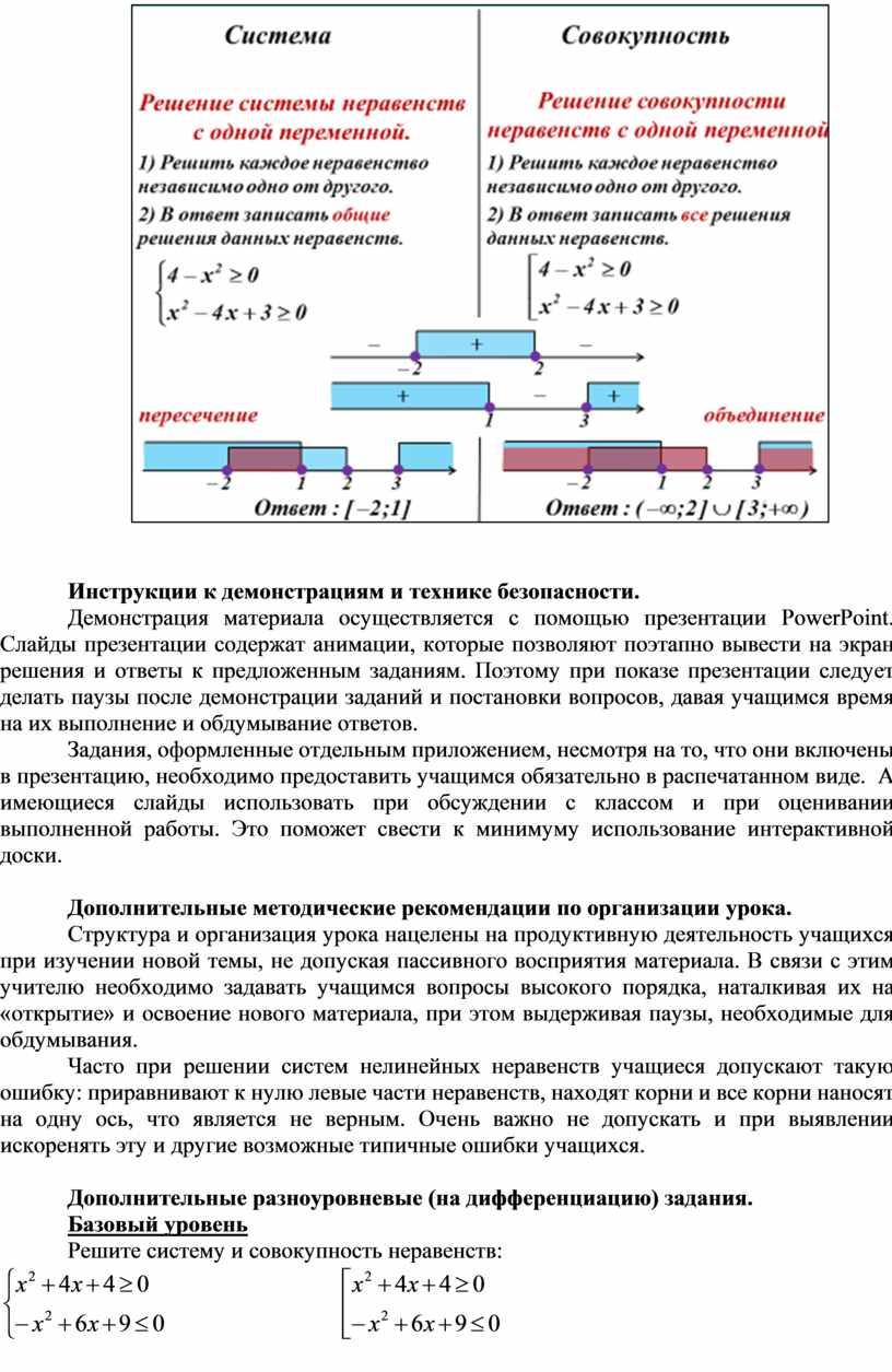 Часто при решении систем нелинейных неравенств учащиеся допускают такую ошибку: приравнивают к нулю левые части неравенств, находят корни и все корни наносят на одну ось, что является не верным. Очень важно не допускать и при выявлении искоренять эту и другие возможные типичные ошибки учащихся.