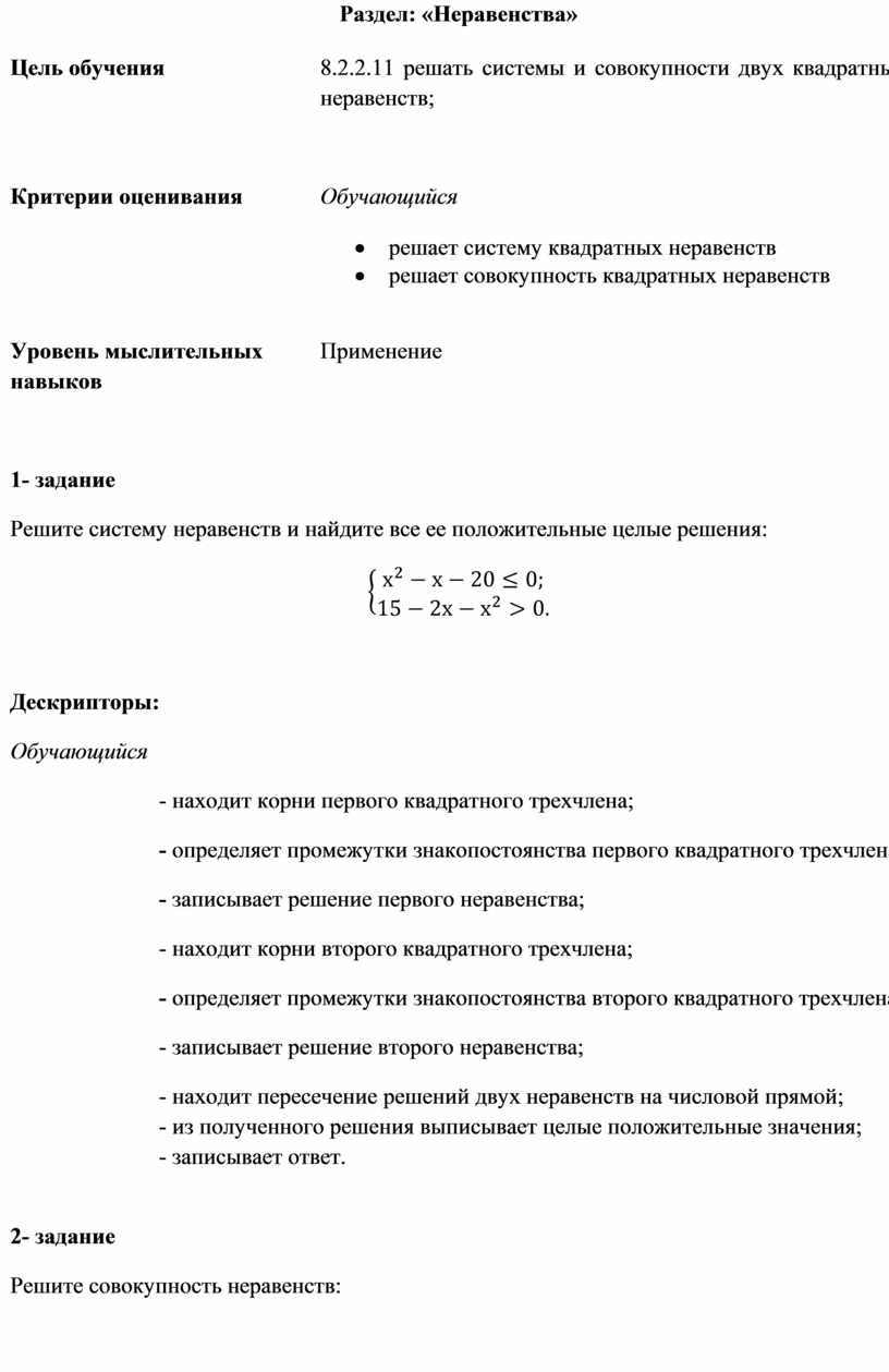 Дескрипторы: Обучающийся - находит корни первого квадратного трехчлена; - определяет промежутки знакопостоянства первого квадратного трехчлена; - записывает решение первого неравенства; - находит корни второго квадратного трехчлена; - определяет промежутки знакопостоянства второго квадратного трехчлена; - записывает решение второго неравенства; - находит пересечение решений двух неравенств на числовой прямой; - из полученного решения выписывает целые положительные значения; - записывает ответ.