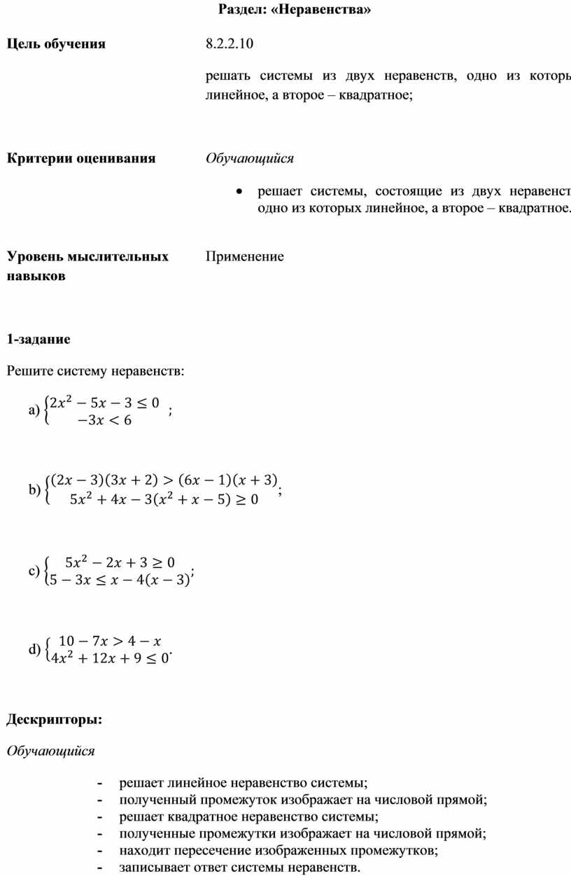 Дескрипторы: Обучающийся - решает линейное неравенство системы; - полученный промежуток изображает на числовой прямой; - решает квадратное неравенство системы; - полученные промежутки изображает на числовой прямой; - находит пересечение изображенных промежутков; - записывает ответ системы неравенств.