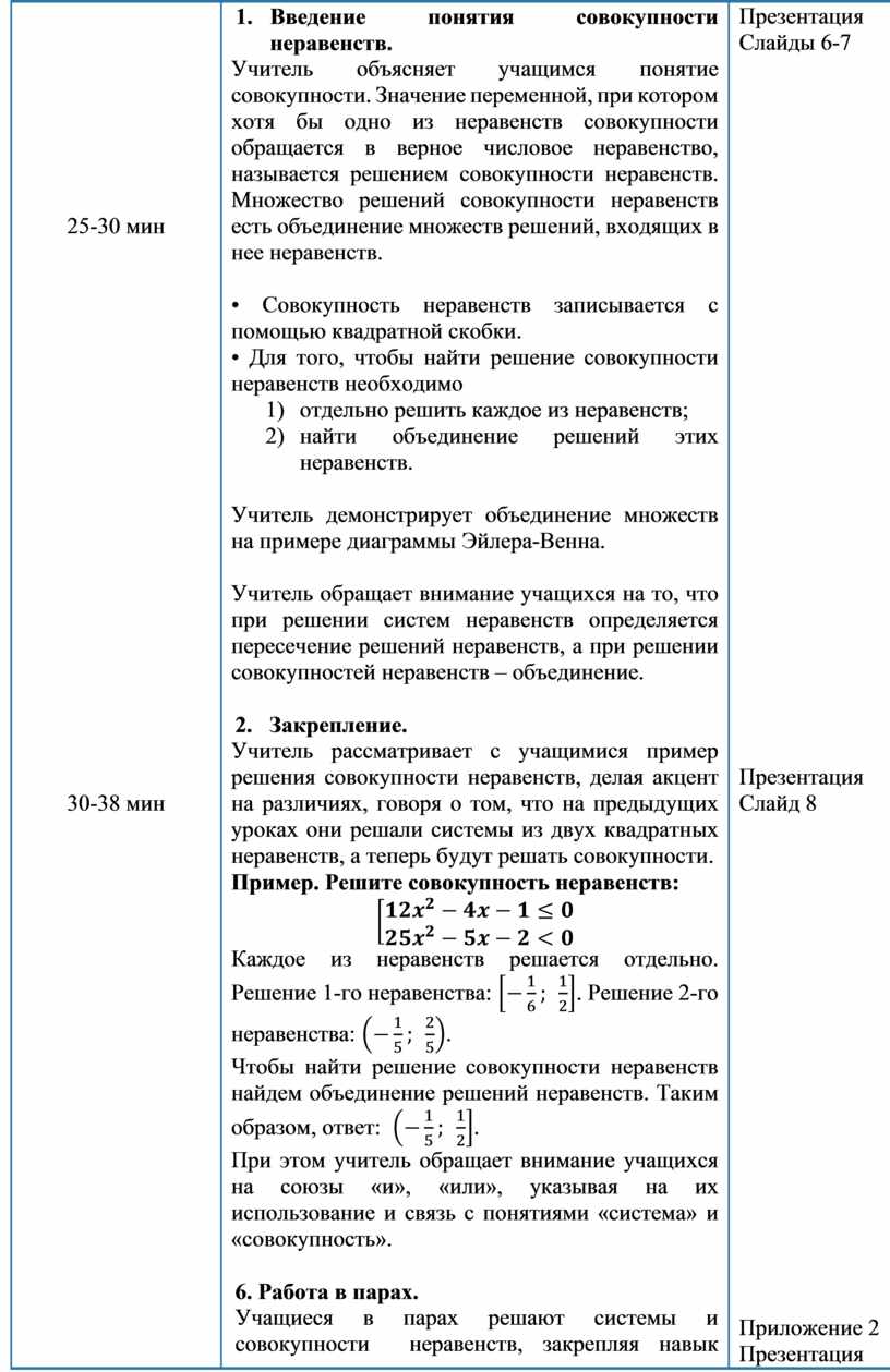 4. Введение понятия совокупности неравенств. Учитель объясняет учащимся понятие совокупности. Значение переменной, при котором хотя бы одно из неравенств совокупности обращается в верное числовое неравенство, называется решением совокупности неравенств. Множество решений совокупности неравенств есть объединение множеств решений, входящих в нее неравенств.