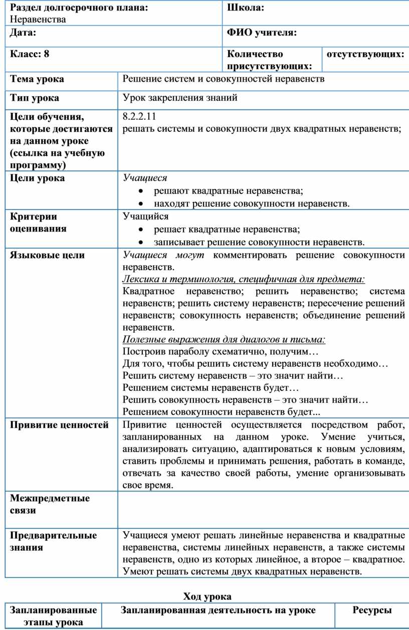 8.2.2.11 решать системы и совокупности двух квадратных неравенств;