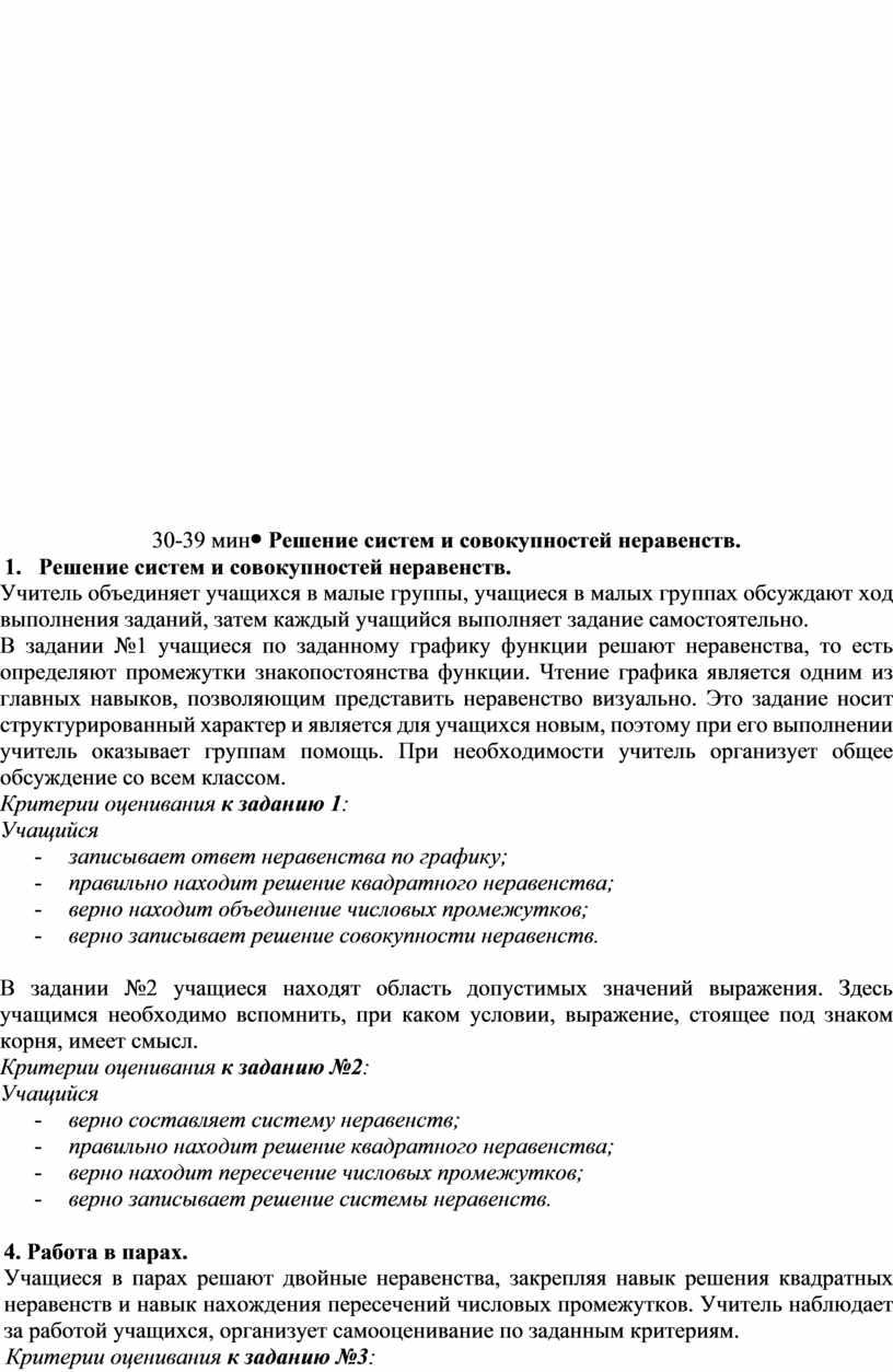 3. Решение систем и совокупностей неравенств. Учитель объединяет учащихся в малые группы, учащиеся в малых группах обсуждают ход выполнения заданий, затем каждый учащийся выполняет задание самостоятельно. В задании №1 учащиеся по заданному графику функции решают неравенства, то есть определяют промежутки знакопостоянства функции. Чтение графика является одним из главных навыков, позволяющим представить неравенство визуально. Это задание носит структурированный характер и является для учащихся новым, поэтому при его выполнении учитель оказывает группам помощь. При необходимости учитель организует общее обсуждение со всем классом. Критерии оценивания к заданию 1: Учащийся - записывает ответ неравенства по графику; - правильно находит решение квадратного неравенства; - верно находит объединение числовых промежутков; - верно записывает решение совокупности неравенств.