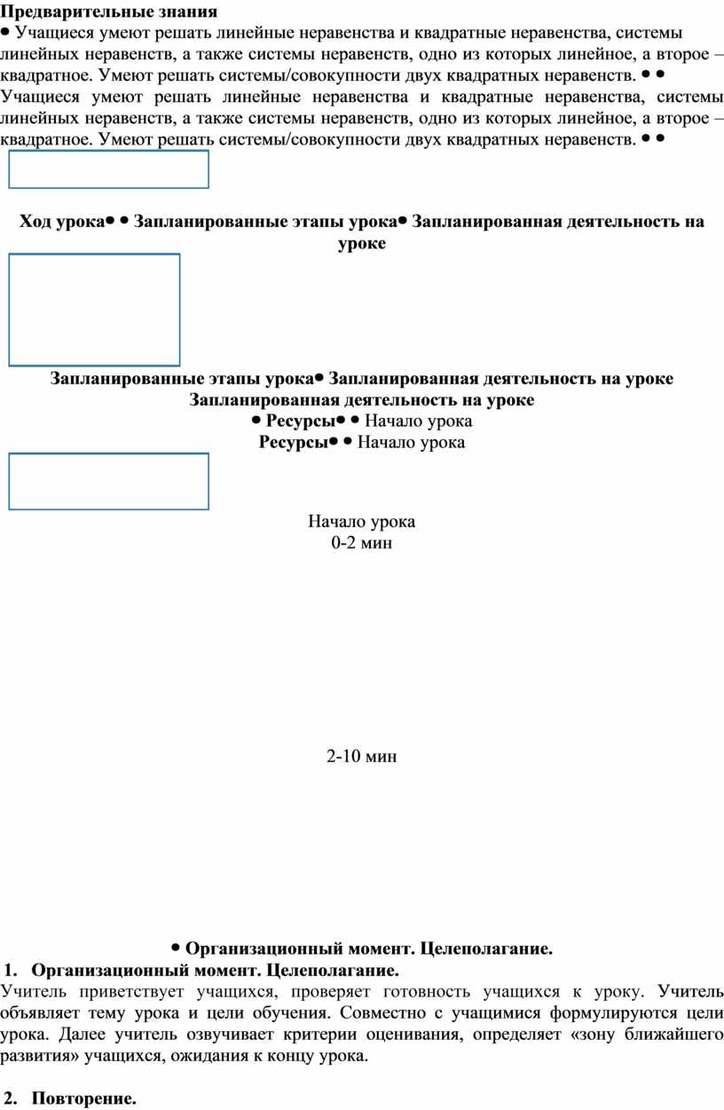 1. Организационный момент. Целеполагание. Учитель приветствует учащихся, проверяет готовность учащихся к уроку. Учитель объявляет тему урока и цели обучения. Совместно с учащимися формулируются цели урока. Далее учитель озвучивает критерии оценивания, определяет «зону ближайшего развития» учащихся, ожидания к концу урока.