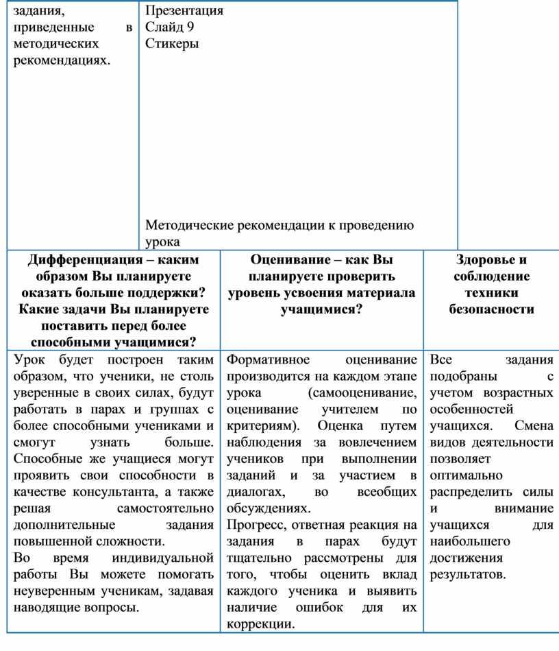 Формативное оценивание производится на каждом этапе урока (самооценивание, оценивание учителем по критериям). Оценка путем наблюдения за вовлечением учеников при выполнении заданий и за участием в диалогах, во всеобщих обсуждениях. Прогресс, ответная реакция на задания в парах будут тщательно рассмотрены для того, чтобы оценить вклад каждого ученика и выявить наличие ошибок для их коррекции. |