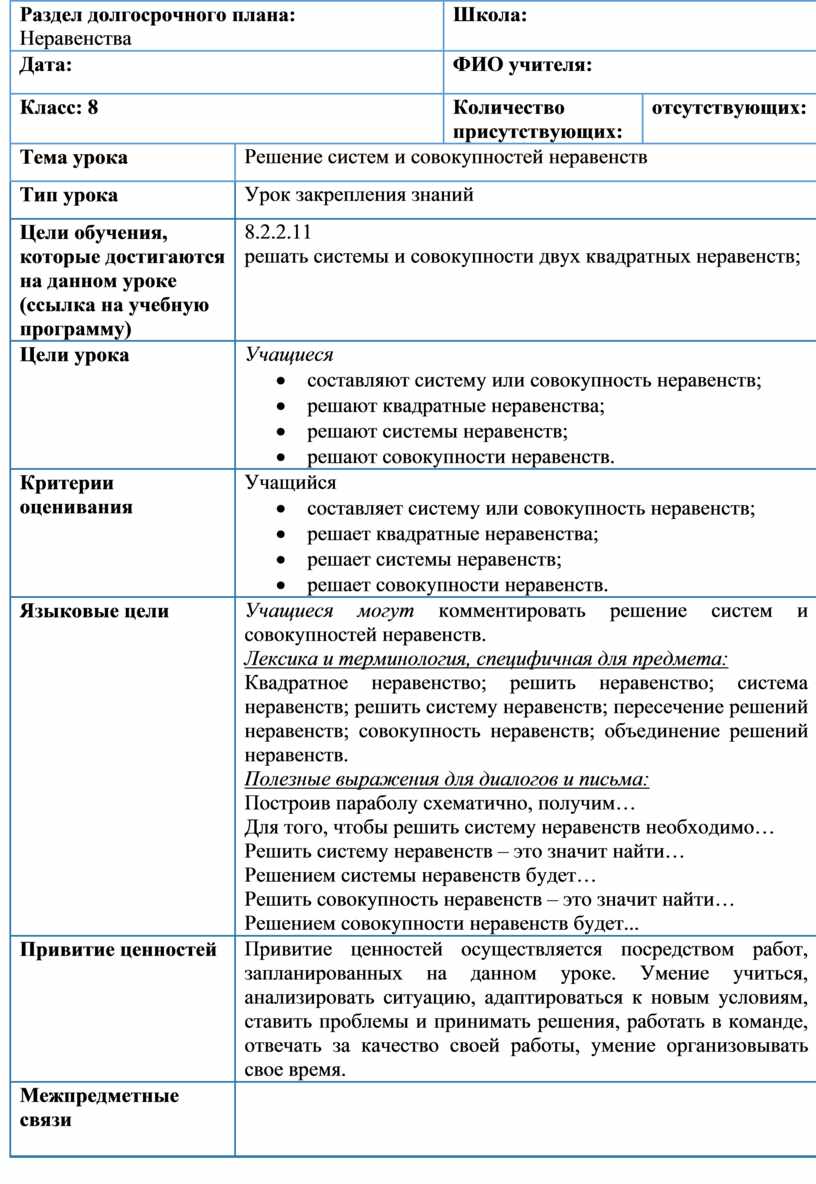 Учащиеся могут комментировать решение систем и совокупностей неравенств. Лексика и терминология, специфичная для предмета: Квадратное неравенство; решить неравенство; система неравенств; решить систему неравенств; пересечение решений неравенств; совокупность неравенств; объединение решений неравенств. Полезные выражения для диалогов и письма: Построив параболу схематично, получим… Для того, чтобы решить систему неравенств необходимо… Решить систему неравенств – это значит найти… Решением системы неравенств будет… Решить совокупность неравенств – это значит найти… Решением совокупности неравенств будет... |
