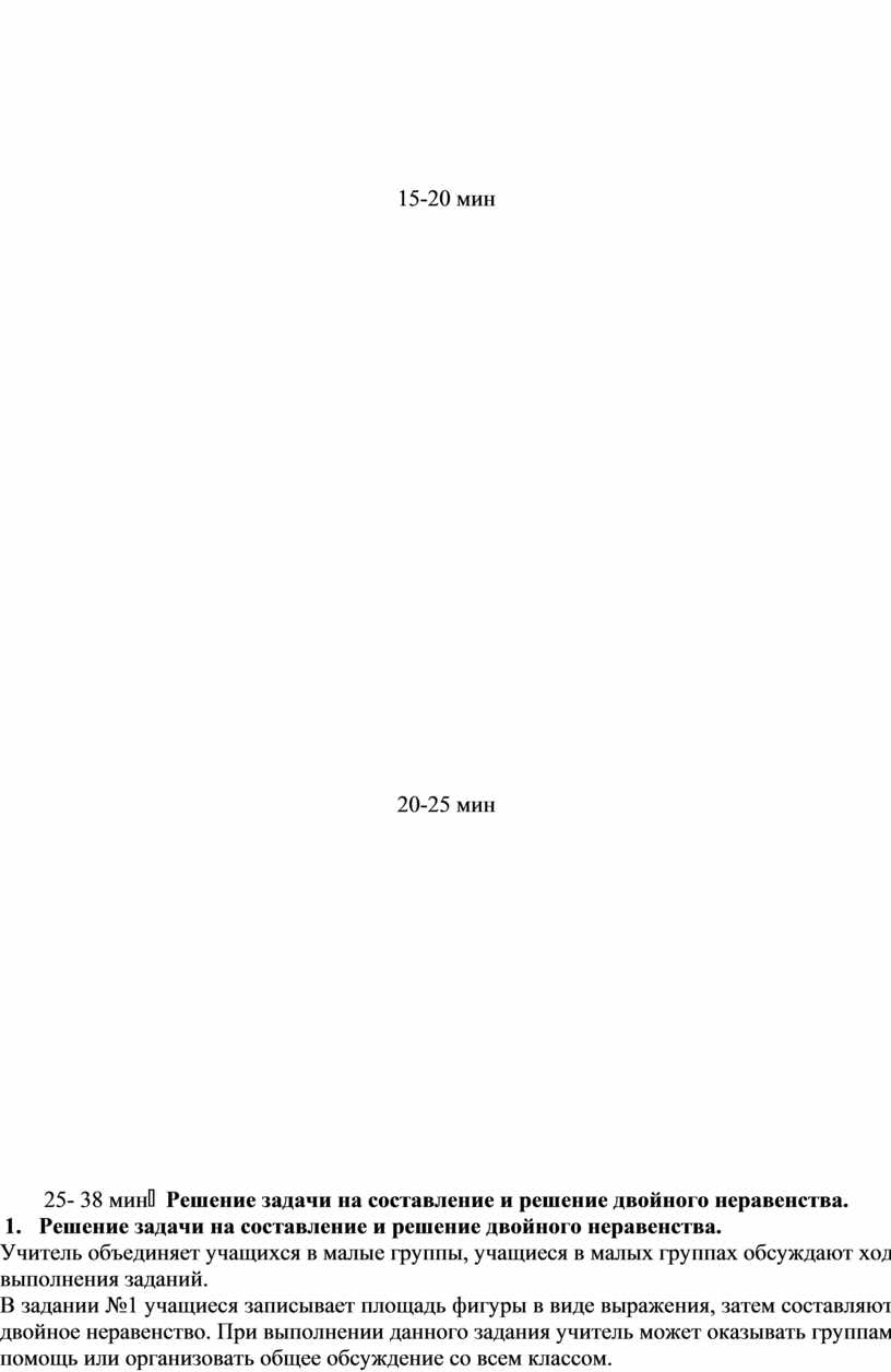 3. Решение задачи на составление и решение двойного неравенства. Учитель объединяет учащихся в малые группы, учащиеся в малых группах обсуждают ход выполнения заданий. В задании №1 учащиеся записывает площадь фигуры в виде выражения, затем составляют двойное неравенство. При выполнении данного задания учитель может оказывать группам помощь или организовать общее обсуждение со всем классом. Критерии оценивания к заданию 1: Учащийся - верно записывает площадь фигуры в виде выражения; - верно составляет двойное неравенство, в составе которого имеются квадратные неравенства; - верно записывает систему неравенств; - правильно определяет корни квадратного трехчлена; - верно записывает решение квадратного неравенства; - правильно находит пересечение числовых промежутков; - правильно указывает ответ к задаче, учитывая ее контекст.