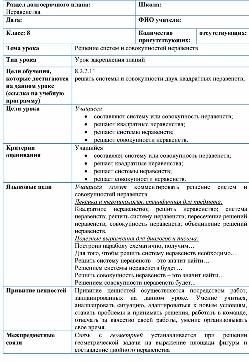 Учащийся · составляет систему или совокупность неравенств; · решает квадратные неравенства; · решает системы неравенств; · решает совокупности неравенств. |