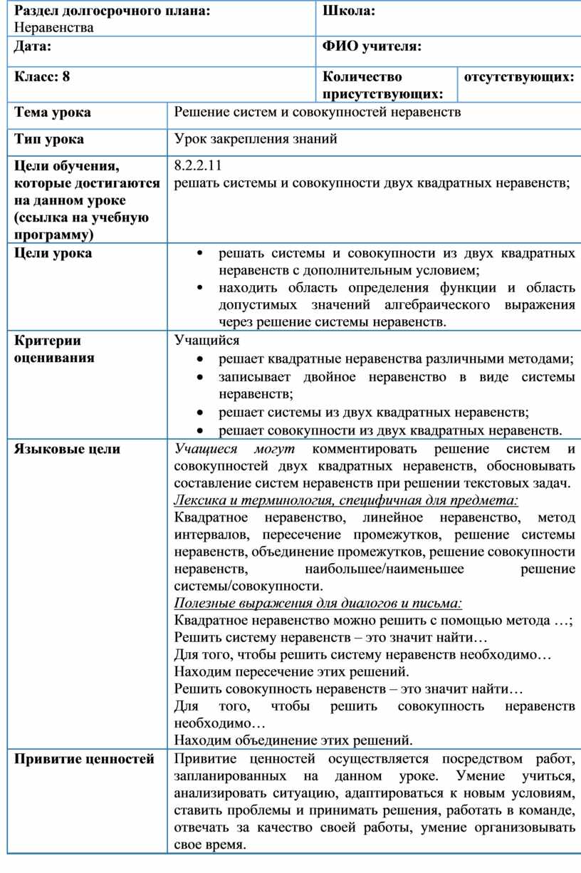 8.2.2.11 решать системы и совокупности двух квадратных неравенств; |