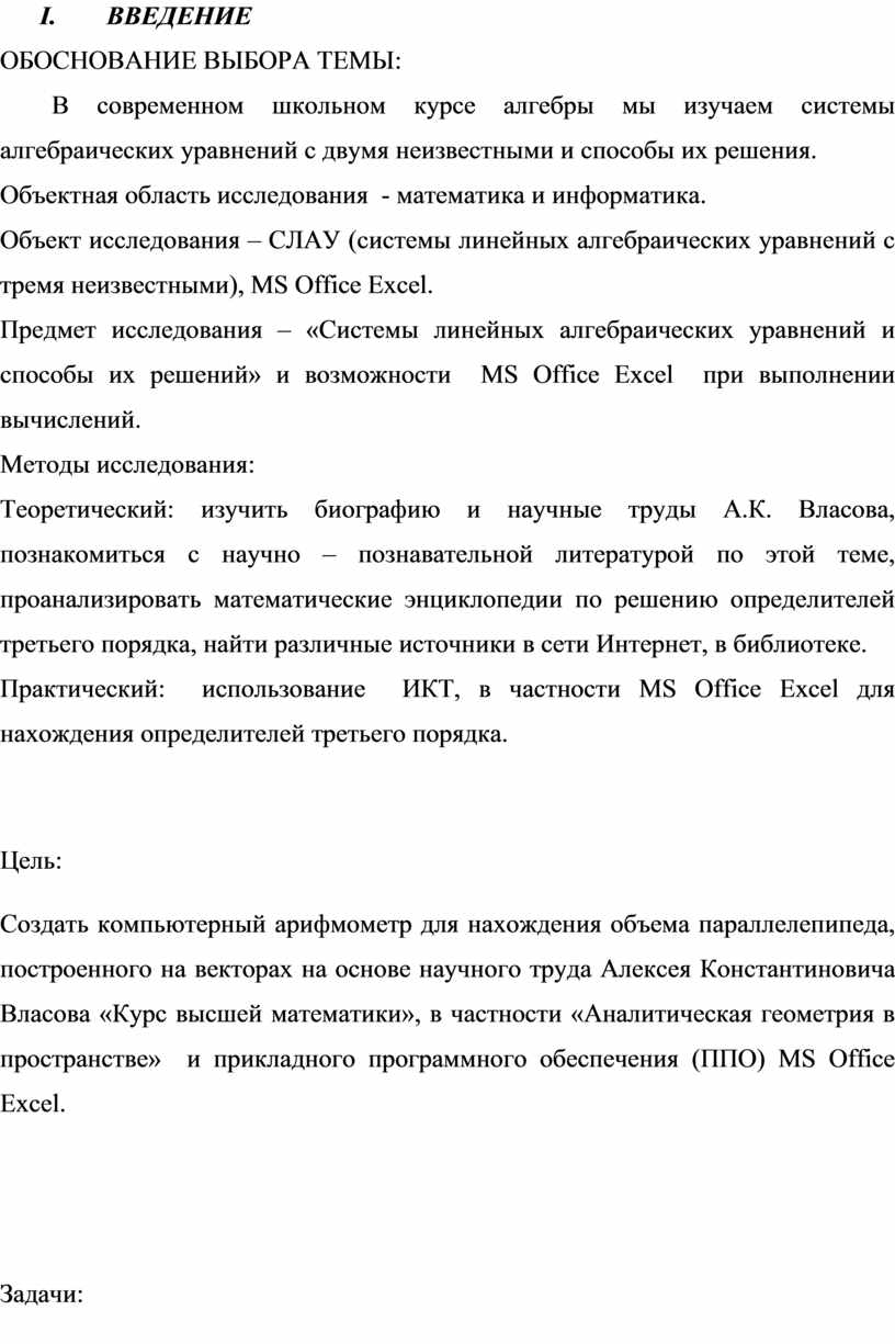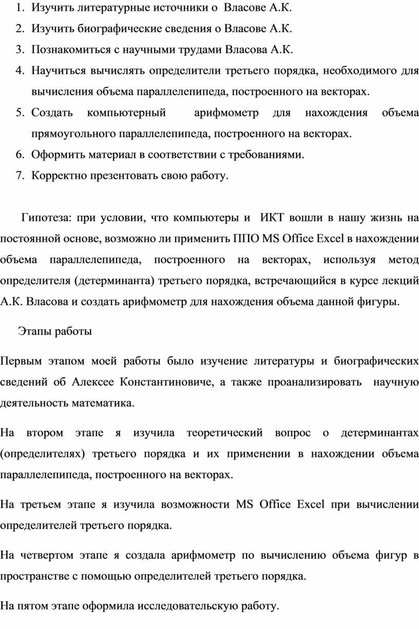 Гипотеза: при условии, что компьютеры и ИКТ вошли в нашу жизнь на постоянной основе, возможно ли применить ППО MS Office Excel в нахождении объема параллелепипеда, построенного на векторах, используя метод определителя (детерминанта) третьего порядка, встречающийся в курсе лекций А.К. Власова и создать арифмометр для нахождения объема данной фигуры.