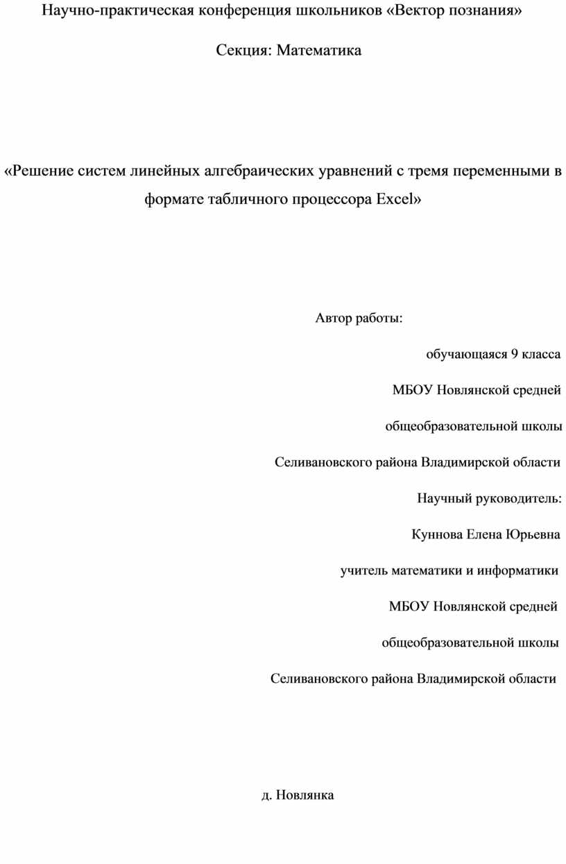 «Решение систем линейных алгебраических уравнений с тремя переменными в формате табличного процессора Excel»