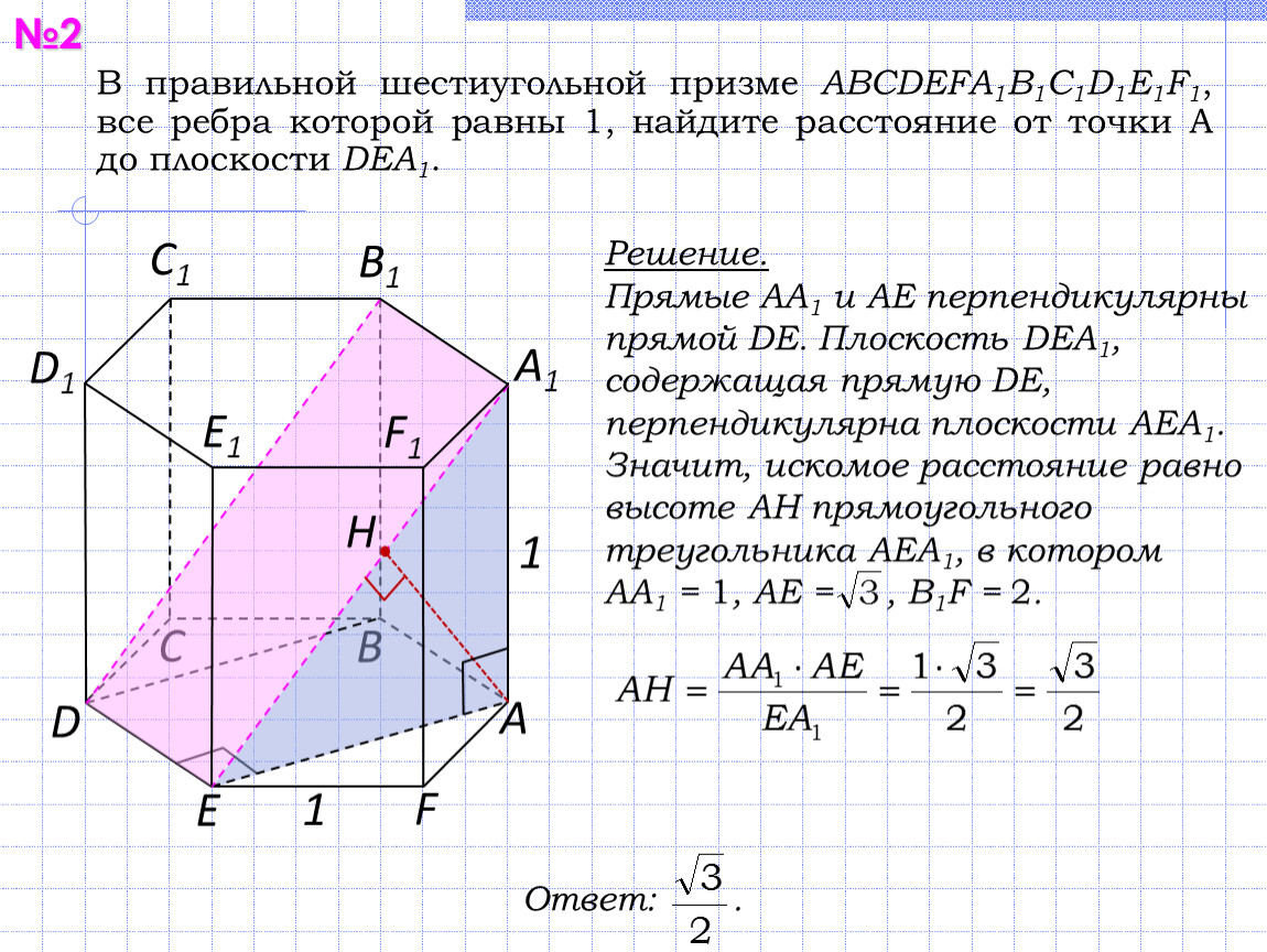 В правильной шестиугольной призме ABCDEFA1B1C1D1E1F1, все ребра которой равны 1, найдите расстояние от точки А до плоскости DЕА1.