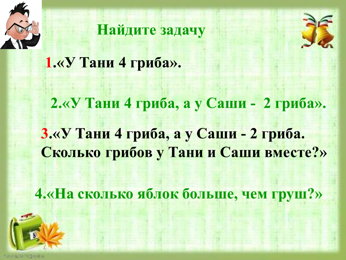 3.«У Тани 4 гриба, а у Саши - 2 гриба. Сколько грибов у Тани и Саши вместе?»