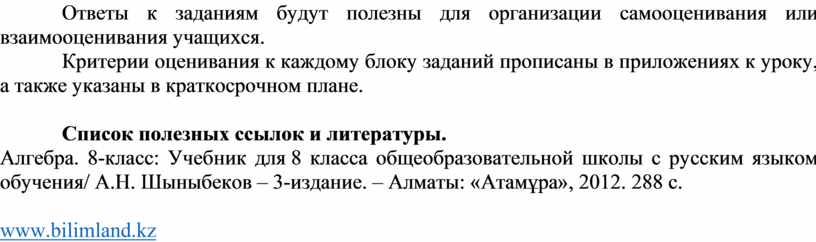 Алгебра. 8-класс: Учебник для 8 класса общеобразовательной школы с русским языком обучения/ А.Н. Шыныбеков – 3-издание. – Алматы: «Атамұра», 2012. 288 с.