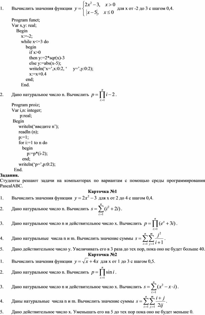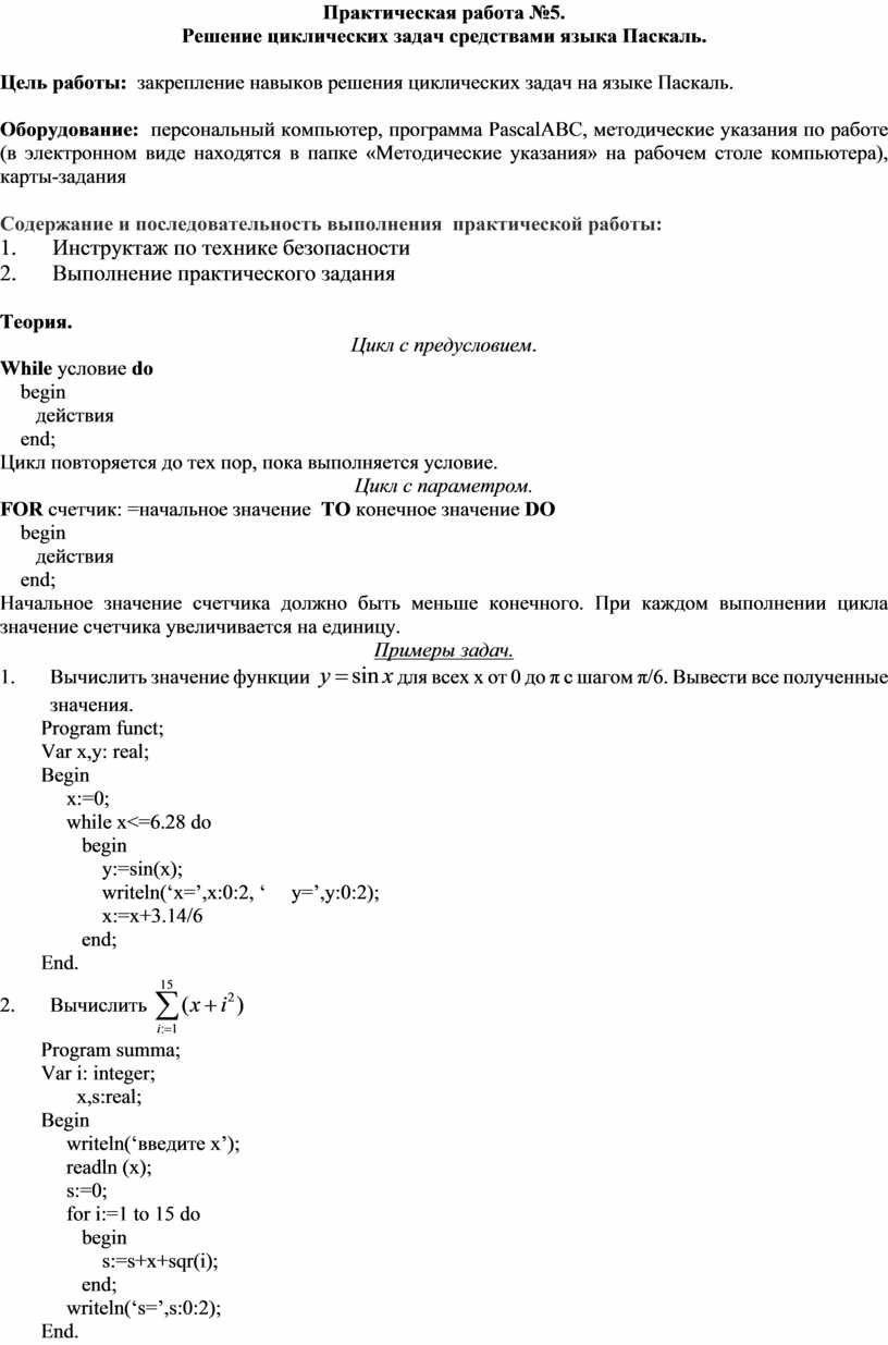 Оборудование: персональный компьютер, программа PascalABC, методические указания по работе (в электронном виде находятся в папке «Методические указания» на рабочем столе компьютера), карты-задания