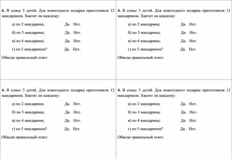 4. В семье 3 детей. Для новогоднего подарка приготовили 12 мандаринов. Хватит ли каждому: