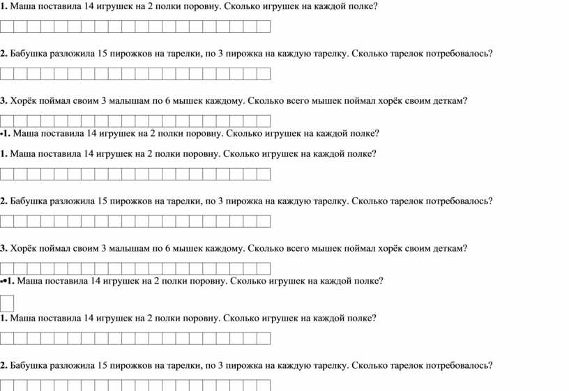 1. Маша поставила 14 игрушек на 2 полки поровну. Сколько игрушек на каждой полке?