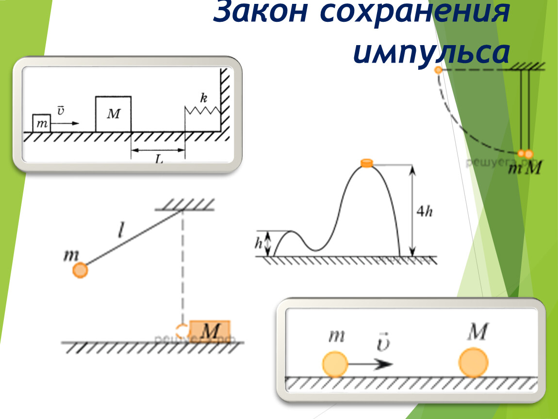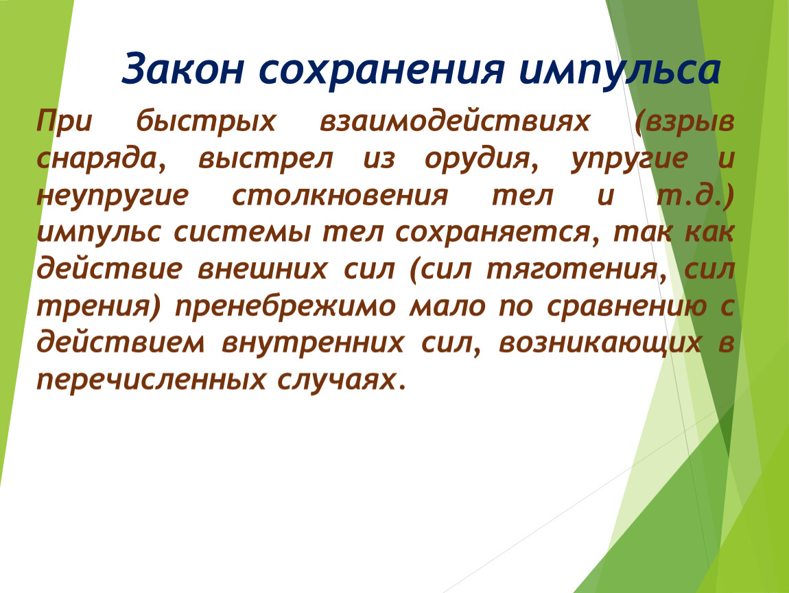 При быстрых взаимодействиях (взрыв снаряда, выстрел из орудия, упругие и неупругие столкновения тел и т.д.) импульс системы тел сохраняется, так как действие внешних сил (сил тяготения, сил трения) пренебрежимо мало по сравнению с действием внутренних сил, возникающих в перечисленных случаях.