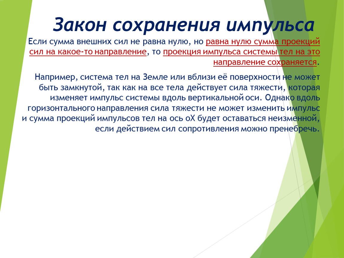 Если сумма внешних сил не равна нулю, но равна нулю сумма проекций сил на какое-то направление, то проекция импульса системы тел на это направление сохраняется.
