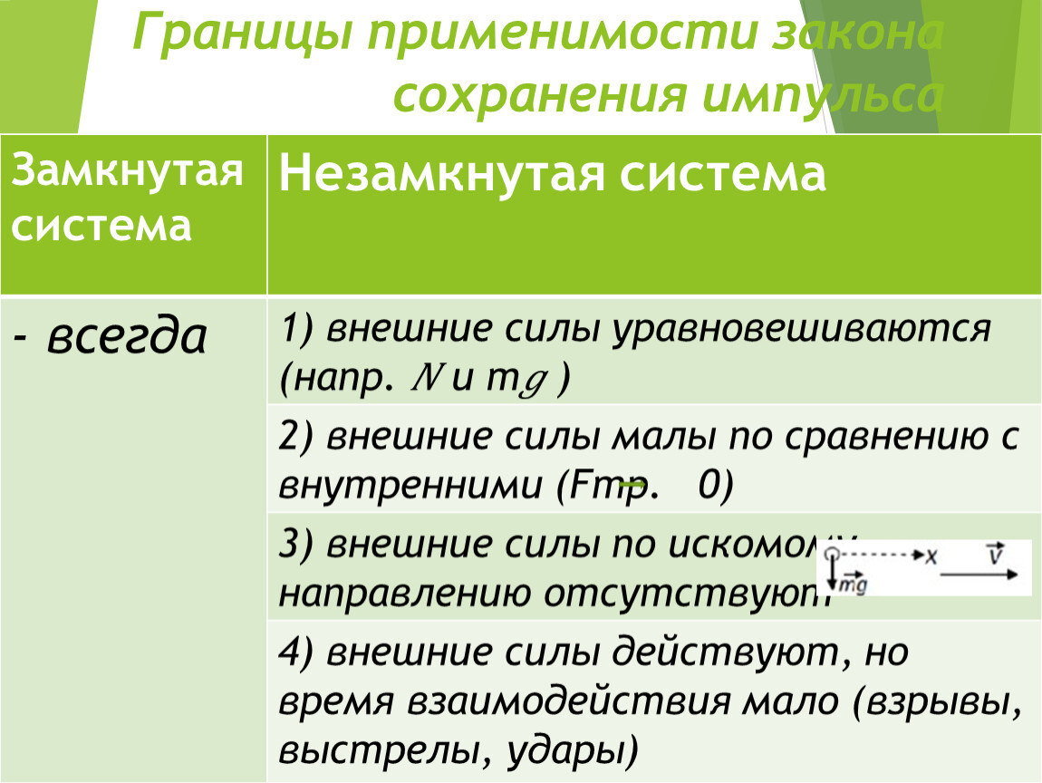 Например, система тел на Земле или вблизи её поверхности не может быть замкнутой, так как на все тела действует сила тяжести, которая изменяет импульс системы вдоль вертикальной оси. Однако вдоль горизонтального направления сила тяжести не может изменить импульс и сумма проекций импульсов тел на ось оX будет оставаться неизменной, если действием сил сопротивления можно пренебречь.