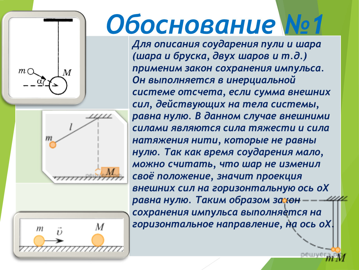 Для описания соударения пули и шара (шара и бруска, двух шаров и т.д.) применим закон сохранения импульса. Он выполняется в инерциальной системе отсчета, если сумма внешних сил, действующих на тела системы, равна нулю. В данном случае внешними силами являются сила тяжести и сила натяжения нити, которые не равны нулю. Так как время соударения мало, можно считать, что шар не изменил своё положение, значит проекция внешних сил на горизонтальную ось оX равна нулю. Таким образом закон сохранения импульса выполняется на горизонтальное направление, на ось оX. | |