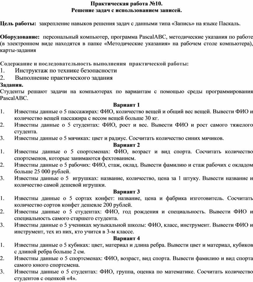 Оборудование: персональный компьютер, программа PascalABC, методические указания по работе (в электронном виде находятся в папке «Методические указания» на рабочем столе компьютера), карты-задания