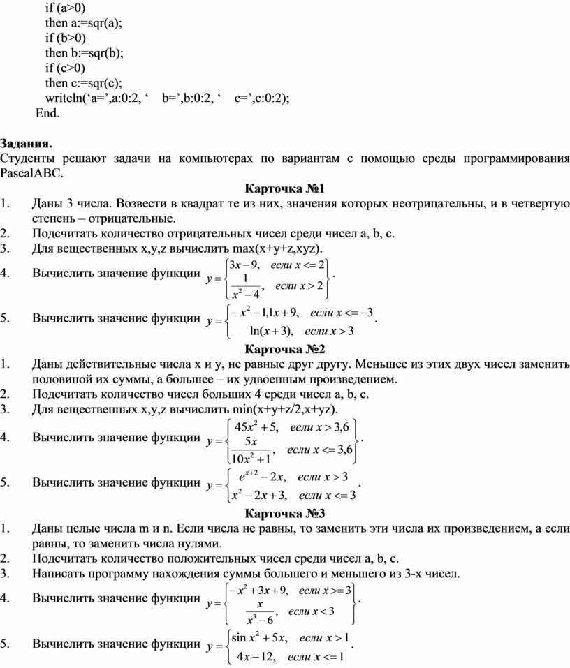 Оборудование: персональный компьютер, программа PascalABC, методические указания по работе (в электронном виде находятся в папке «Методические указания» на рабочем столе компьютера), карты-задания