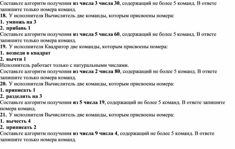 Составьте алгоритм получения из числа 3 числа 30, содержащий не более 5 команд. В ответе запишите только номера команд.