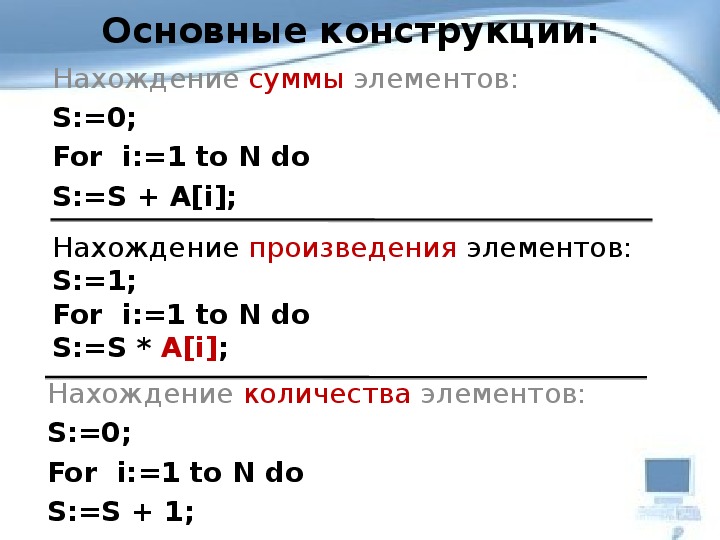 скобки, увеличение значения переменной: если сумма - прибавляется элемент, если количество -