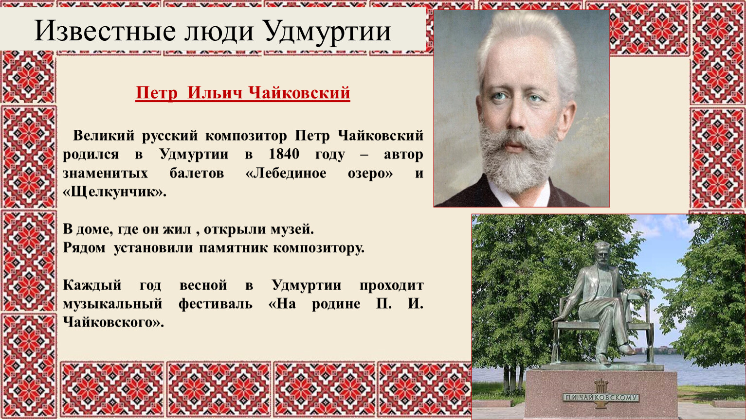 Великий русский композитор Петр Чайковский родился в Удмуртии в 1840 году – автор знаменитых балетов «Лебединое озеро» и «Щелкунчик».