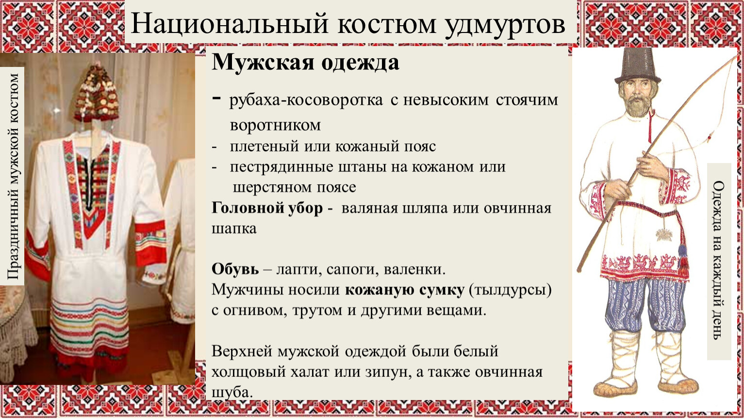 Мужская одежда - рубаха-косоворотка с невысоким стоячим воротником- плетеный или кожаный пояс - пестрядинные штаны на кожаном или шерстяном поясеГоловной убор - валяная шляпа или овчинная шапкаОбувь – лапти, сапоги, валенки. Мужчины носили кожаную сумку (тылдурсы) с огнивом, трутом и другими вещами. Верхней мужской одеждой были белый холщовый халат или зипун, а также овчинная шуба.