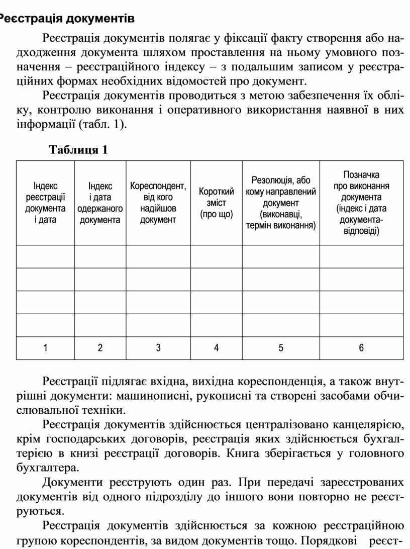 Реєстрація документів проводиться з метою забезпечення їх облі- ку, контролю виконання і оперативного використання наявної в них інформації (табл. 1).