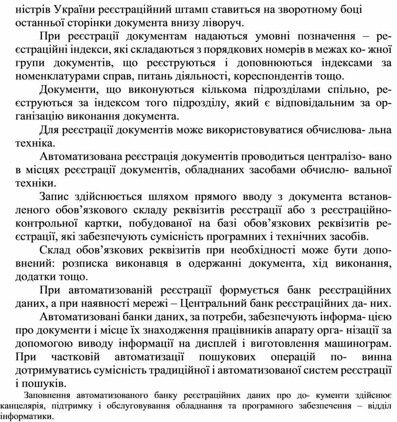 Реєстрація документів полягає у фіксації факту створення або на- дходження документа шляхом проставлення на ньому умовного поз- начення – реєстраційного індексу – з подальшим записом у реєстра- ційних формах необхідних відомостей про документ.