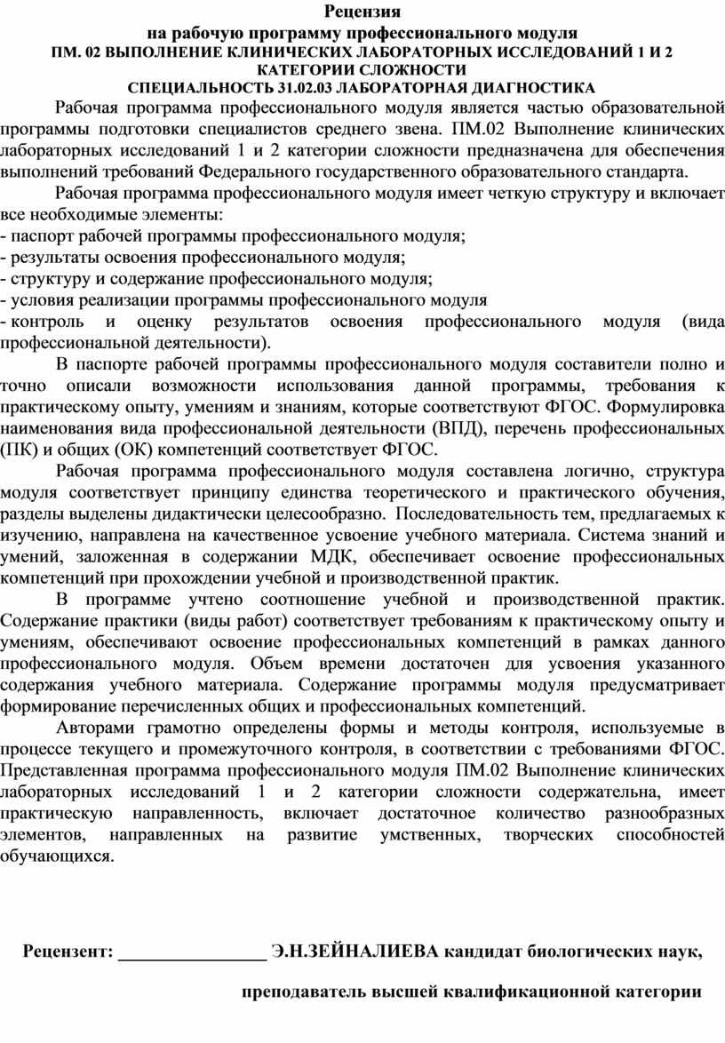 Авторами грамотно определены формы и методы контроля, используемые в процессе текущего и промежуточного контроля, в соответствии с требованиями ФГОС. Представленная программа профессионального модуля ПМ.02 Выполнение клинических лабораторных исследований 1 и 2 категории сложности содержательна, имеет практическую направленность, включает достаточное количество разнообразных элементов, направленных на развитие умственных, творческих способностей обучающихся.