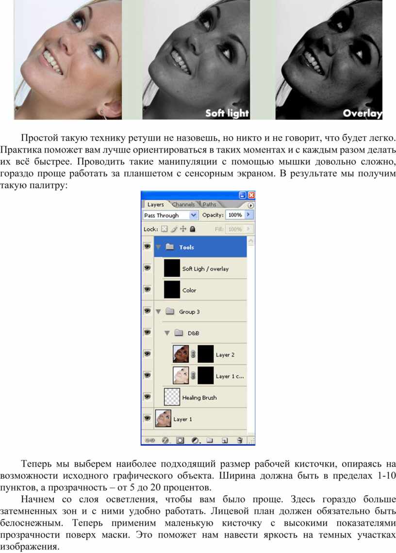 Начнем со слоя осветления, чтобы вам было проще. Здесь гораздо больше затемненных зон и с ними удобно работать. Лицевой план должен обязательно быть белоснежным. Теперь применим маленькую кисточку с высокими показателями прозрачности поверх маски. Это поможет нам навести яркость на темных участках изображения.