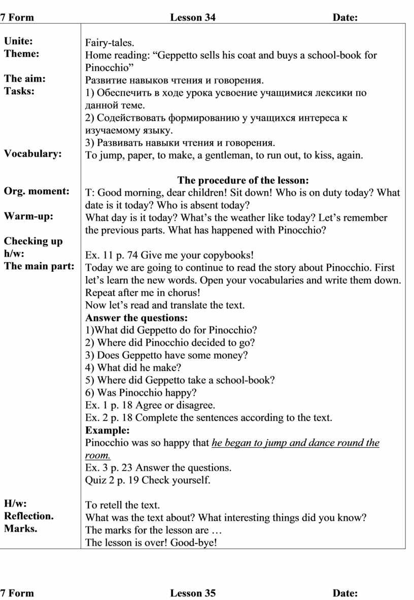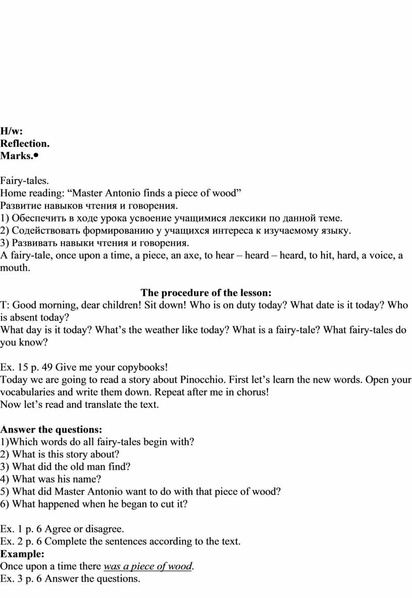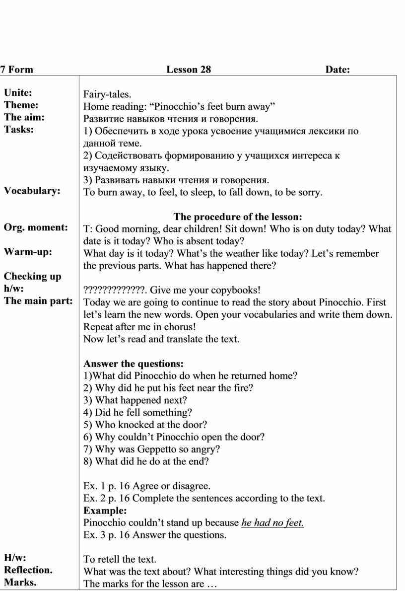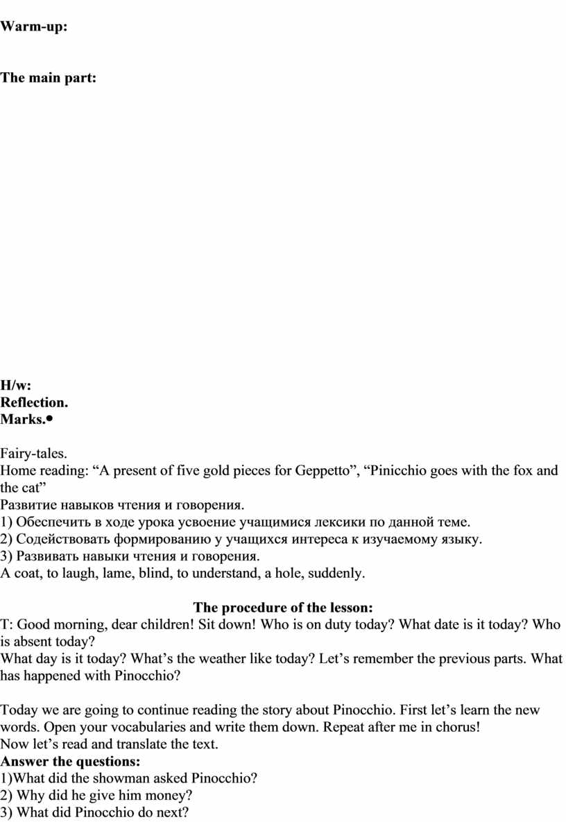 Fairy-tales. Home reading: “A present of five gold pieces for Geppetto”, “Pinicchio goes with the fox and the cat” Развитие навыков чтения и говорения. 1) Обеспечить в ходе урока усвоение учащимися лексики по данной теме. 2) Содействовать формированию у учащихся интереса к изучаемому языку. 3) Развивать навыки чтения и говорения. A coat, to laugh, lame, blind, to understand, a hole, suddenly.