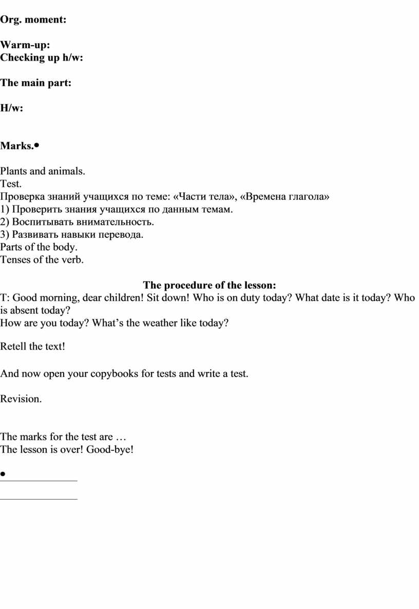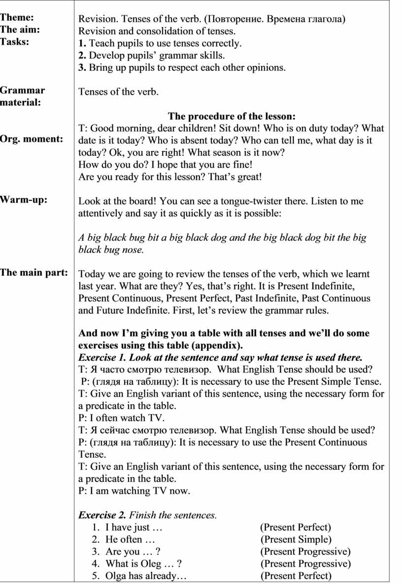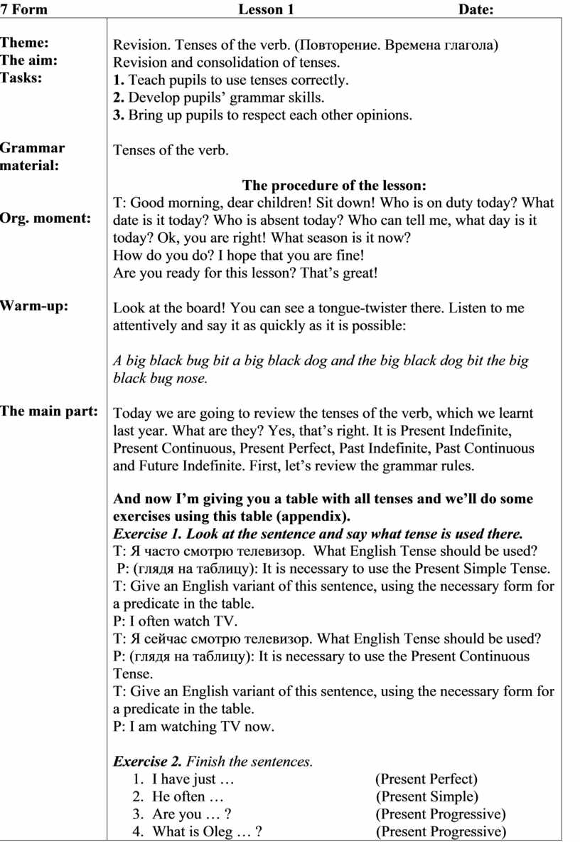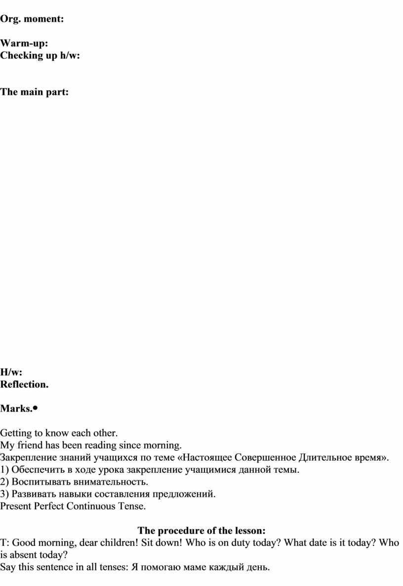 The procedure of the lesson: T: Good morning, dear children! Sit down! Who is on duty today? What date is it today? Who is absent today? Say this sentence in all tenses: Я помогаю маме каждый день.
