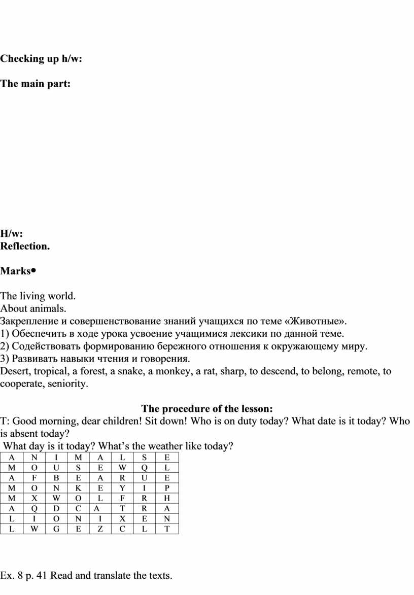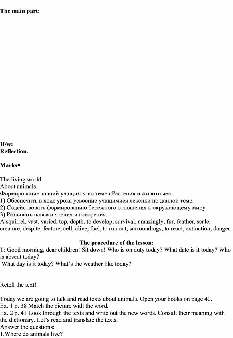 The procedure of the lesson: T: Good morning, dear children! Sit down! Who is on duty today? What date is it today? Who is absent today? What day is it today? What’s the weather like today? I’ll say the word in English and you should translate it into Russian.