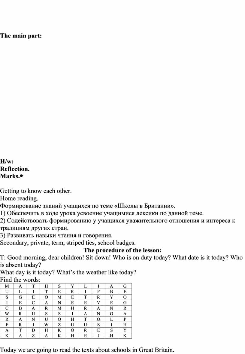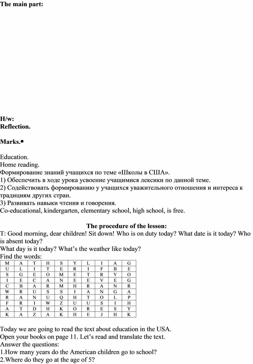 The procedure of the lesson: T: Good morning, dear children! Sit down! Who is on duty today? What date is it today? Who is absent today? What day is it today? What’s the weather like today? Now I’ll show you the verb and you should translate it and name the three forms of this verb. Eg.: be - … - …. (быть, находиться, являться)