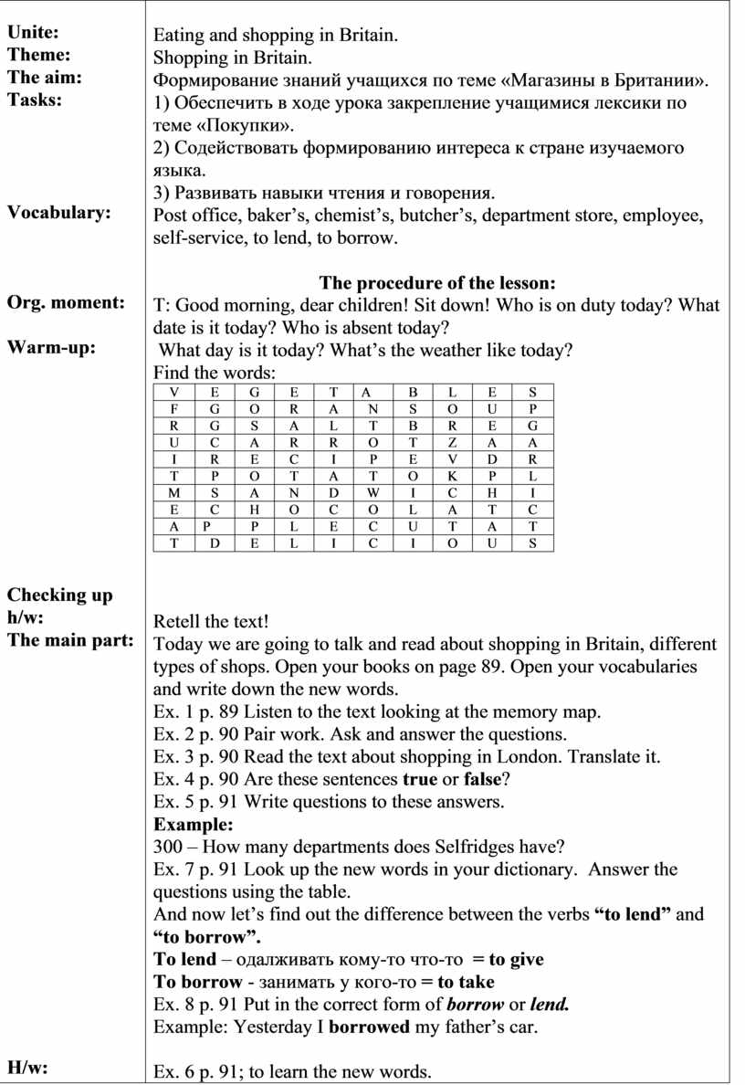 Retell the text! Today we are going to talk and read about shopping in Britain, different types of shops. Open your books on page 89. Open your vocabularies and write down the new words. Ex. 1 p. 89 Listen to the text looking at the memory map. Ex. 2 p. 90 Pair work. Ask and answer the questions. Ex. 3 p. 90 Read the text about shopping in London. Translate it. Ex. 4 p. 90 Are these sentences true or false? Ex. 5 p. 91 Write questions to these answers. Example: 300 – How many departments does Selfridges have? Ex. 7 p. 91 Look up the new words in your dictionary. Answer the questions using the table. And now let’s find out the difference between the verbs “to lend” and “to borrow”. To lend – одалживать кому-то что-то = to give To borrow - занимать у кого-то = to take Ex. 8 p. 91 Put in the correct form of borrow or lend. Example: Yesterday I borrowed my father’s car.